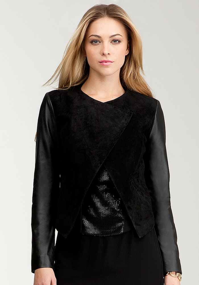With glossy leather sleeves and contrast suede collar detail, this bebe leather jacket is sure to lend your winter wardrobe an undeniably glamorous polish.