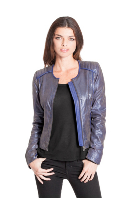 Edgy with essential metallic shine, this soft leather jacket is an instant favorite among the fashion forward. The one-of-a-kind look and feel keeps you ahead of the trends season after season. • Collarless leather jacket. Long sleeves. • Contrasting panels at outer sleeves. Piping along neckline, front and back yoke, princess seams and pocket trim. Rows of topstitch detail at lightly padded shoulders. Zipper pockets at lower front. • Front zipper closure. Lined. • 80% Goat Leather, 20% Sheep Leather. Lining: 100% Polyester.