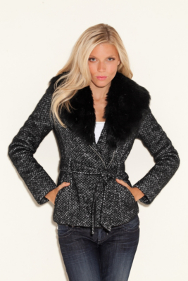 This season, cover up in style with this always-chic tweed jacket. Its luxe faux-fur collar adds a glamorous touch and the belted waist gives you a trend-right peplum silhouette you can wear at any time of day. • Oversized shawl collar with removable faux fur. Long sleeves. • Tweed. Belted waist. Welt pockets at lower front. • Off-center zipper closure. Lined. • 52% Polyester, 48% Wool. Lining: 100% Polyester. Faux Fur: 59% Modacrylic, 27% Acrylic, 14% Polyester.