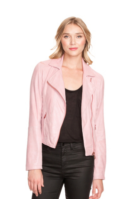 Luxuriously soft leather is finished with a subtle sheen and lace-up detail for a glamorous take on the moto jacket. Rose gold-tone hardware puts the final touch on this need-to-own piece. • Suede leather moto jacket. Long sleeves. • Lace-up detail at sides. Two zipper pockets. Embossed metallic leather logo tab at lower back. Rose gold-tone hardware. • Off-center zipper closure. Lightweight woven lining. • 100% Goat Leather. Lining: 100% Cotton.