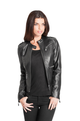 The perfect topper for jeans, dresses and everything else, this faux-leather moto jacket adds a coveted edge to your looks. The snap collar and zipper pockets give it authentic motorcycle style. • Faux-leather moto jacket. Mock collar with snap. Long sleeves with zipper cuffs. • Epaulettes. Three zipper pockets. • Front zipper closure. Lined. • 100% Polyurethane. Lining: 100% Polyester.
