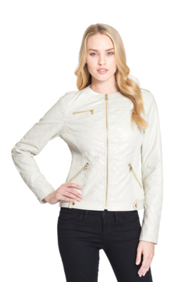 Ultra-modern and sleek, this leather-like jacket is a must for style-setters. Mixed textures and high-shine hardware are the unique touches that make the statement you're after. • Collarless faux-leather jacket. Long sleeves with triple button closures. • Quilted details with textured side seams. Epaulettes. Belt loops. Zipper pockets at lower front and right chest. • Front zipper closure. Lined. • 100% Polyurethane. Lining: 100% Polyester.